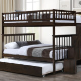 This Double Over Double Wooden Bunk Bed with Trundle is designed to deliver maximum comfort, safety, and functionality for growing families. Featuring two spacious double-size sleeping areas, it provides ample room for kids or guests. Constructed from solid pine wood, the bunk bed includes full-length guardrails on the upper bunk for enhanced safety. The built-in staircase with handrail ensures secure access while offering practical storage shelves. A smooth pull-out trundle adds extra sleeping space or convenient storage, making this bunk bed an ideal solution for shared or space-conscious bedrooms. Its clean-lined, timeless design complements a variety of interior styles.
