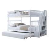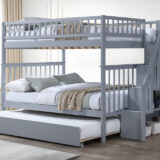 Double over double wooden bunk bed with storage staircase, full-length guardrails, and pull-out trundle. A perfect space-saving and safe sleeping solution for kids’ bedrooms.